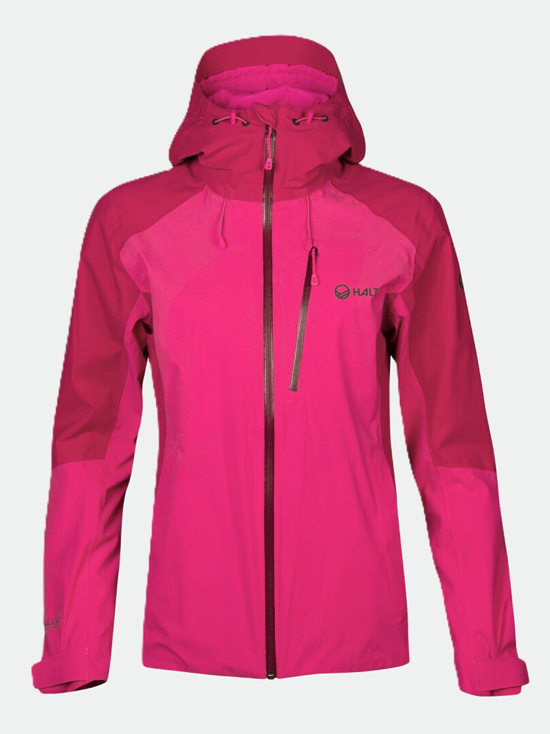 Halti Biegga Naisten DrymaxX Kuoritakki on kirkkaan pinkki kuoritakki, jossa on huppu, rintatasku ja vedenpitävä kangas.