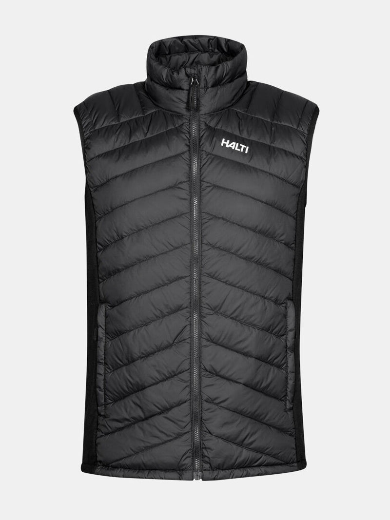 Halti Huippu Untuvaliivi Miesten on musta, hihaton liivi Pertex Quantum Ripstop -materiaalilla ja rintalogolla.