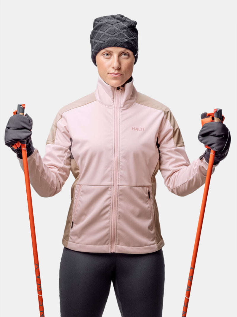 Halti Huuru Maastohiihtopuku Naisten: vaaleanpunainen & beige softshell-takki mustalla, täydellinen talviharjoittelu.