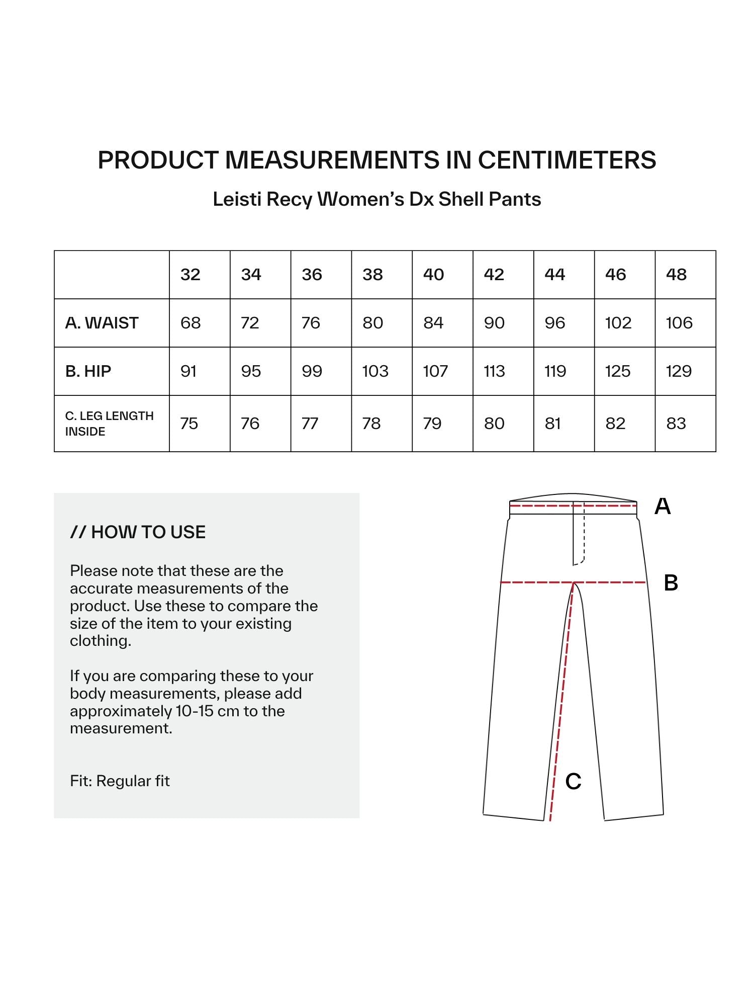 Halti Leisti DX Kuorihousut Naisten: suoralinjaiset mustat kuorihousut napilla ja vetoketjulla, kuvassa vaalealla pohjalla.
