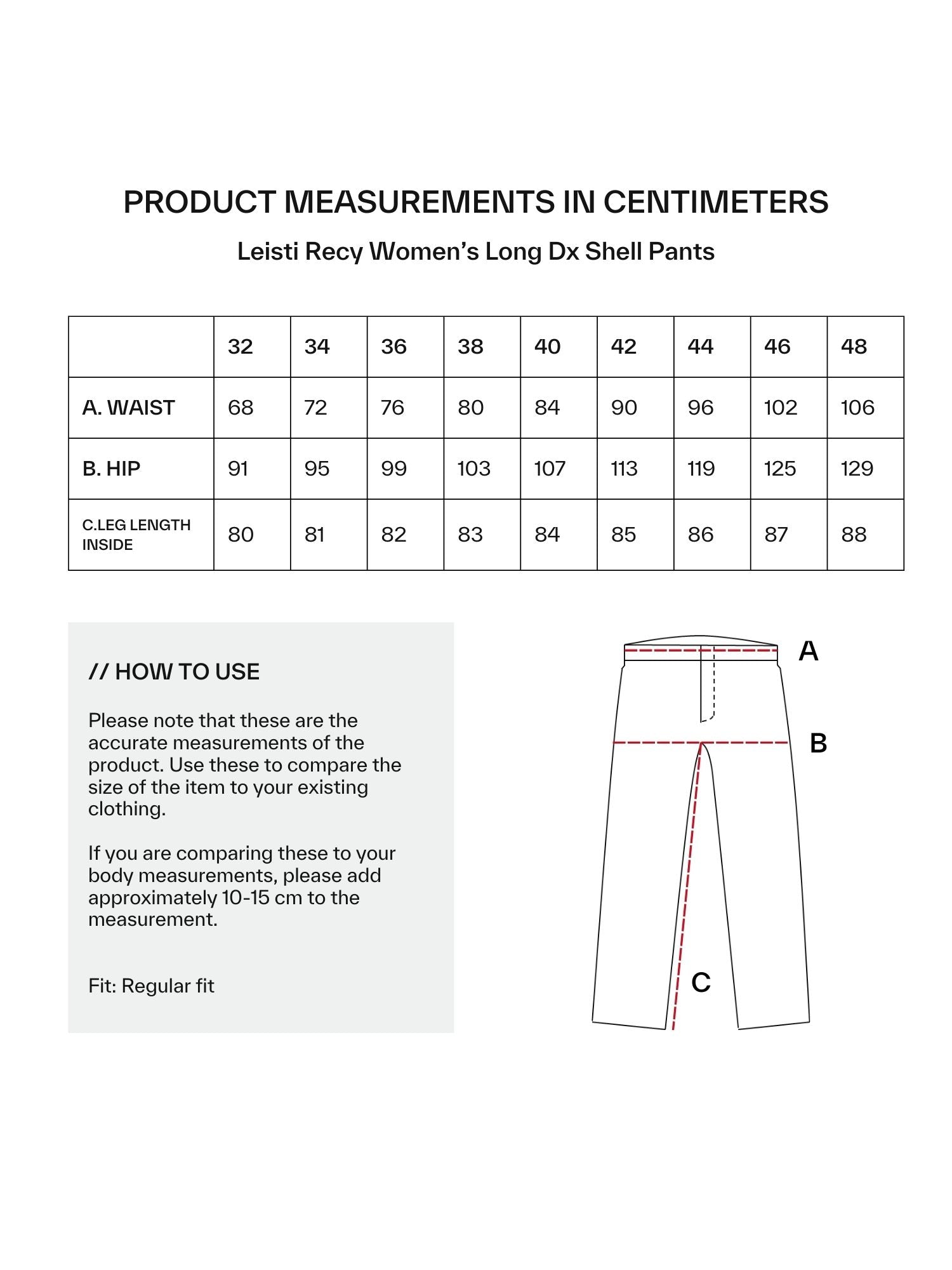 Housut ovat mallistomme ECO-tuote, sillä niiden valmistuksessa on käytetty 50% kierrätettyä polyesteria ja housut ovat valmistettu ilman fluoriyhdisteitä (PFC-vapaat). Leisti