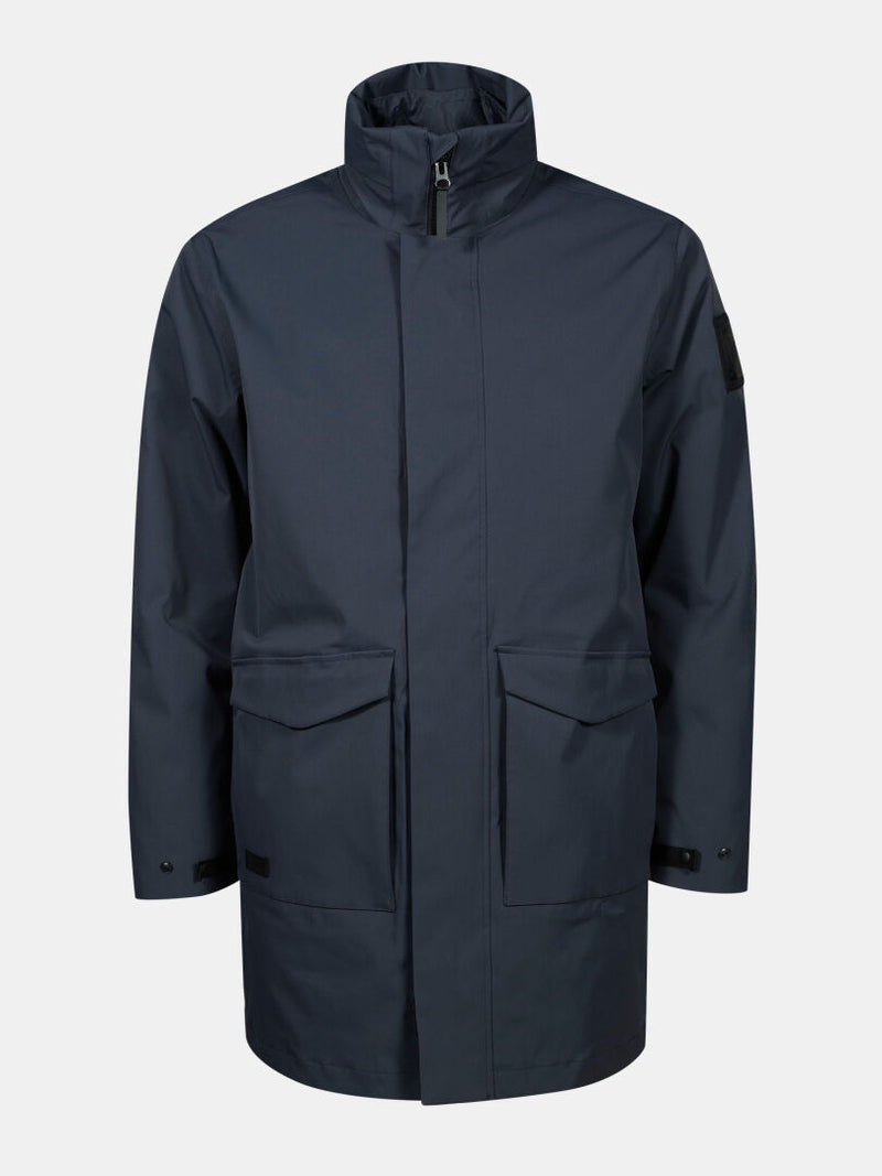 Halti Synkas II 3in1 DX Parka Miesten: tummansininen parka, jossa on korkea kaulus, suuret taskut ja vedenpitävä vetoketju.