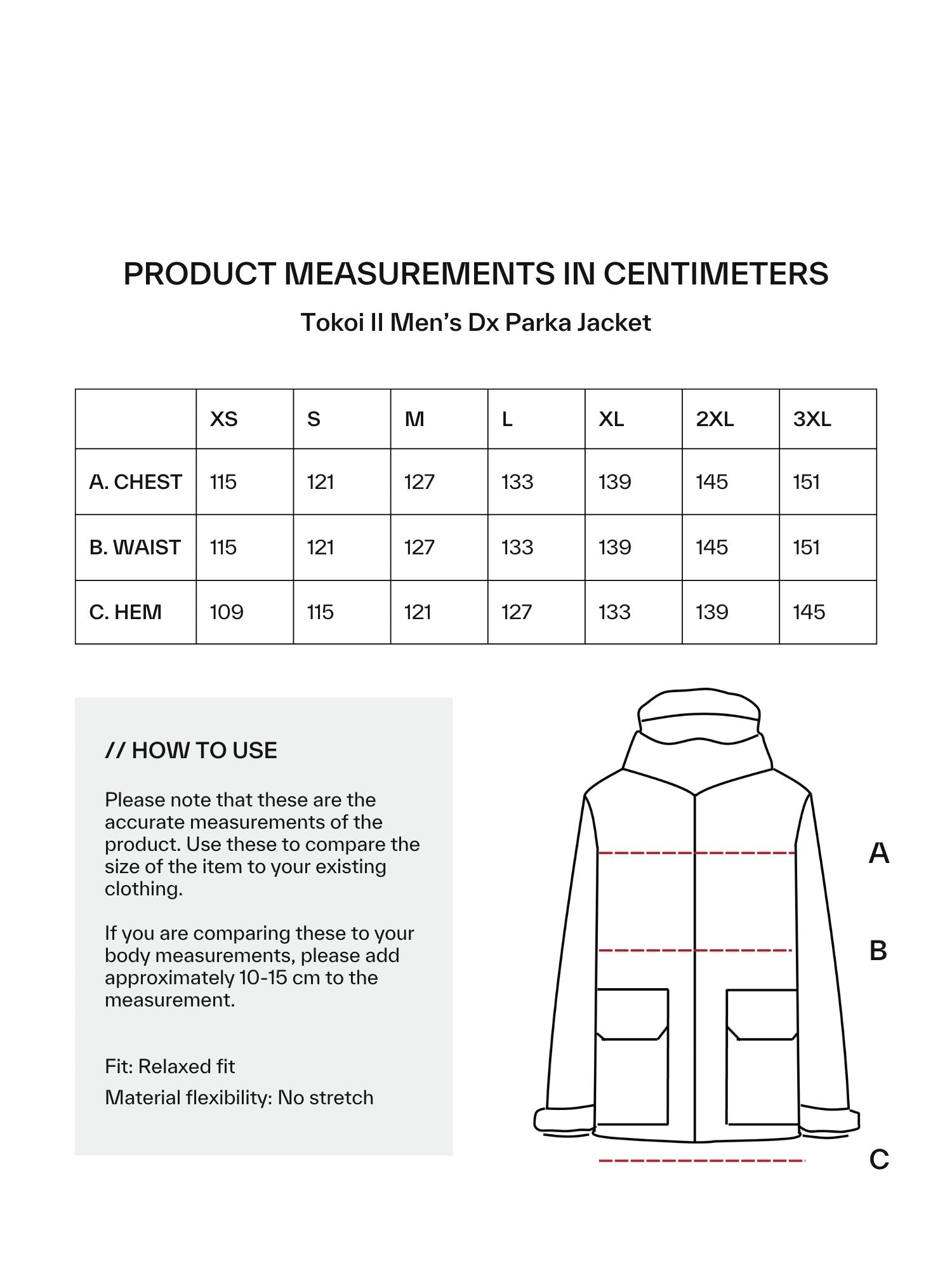Kokotaulukko tuotteelle Halti Tokoi II DX Parkatakki Miesten, jossa DrymaxX; sisältää kaavion ja cm-mitat.